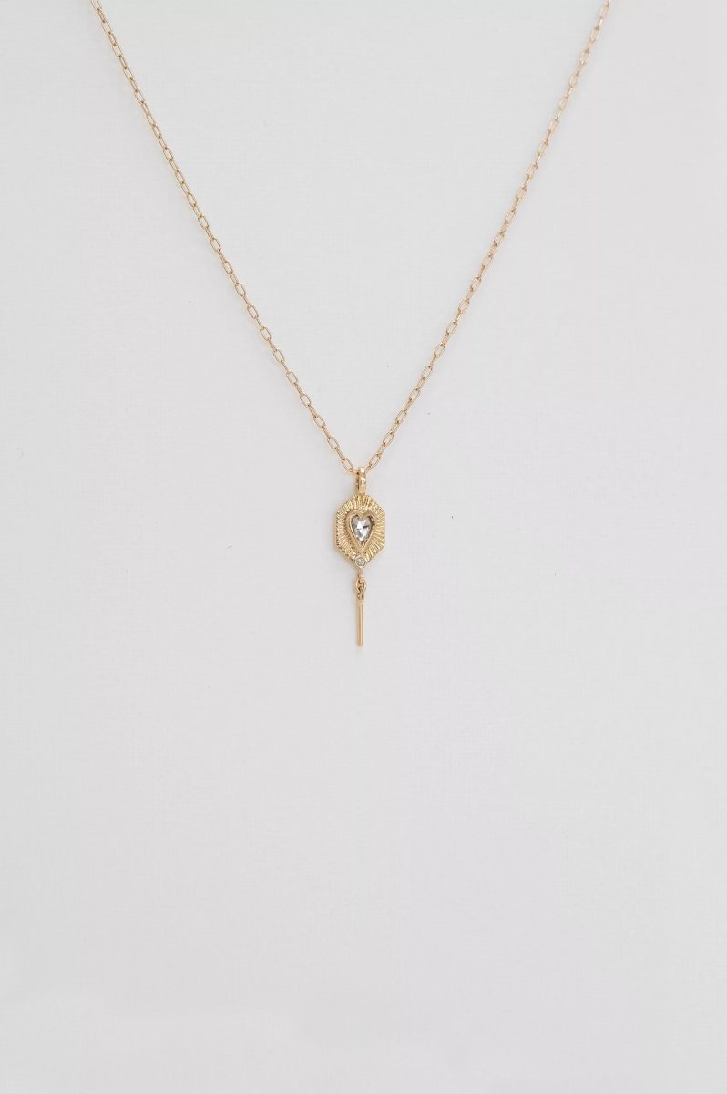 A rose cut champagne colored diamond heart set on a gold plate necklace.