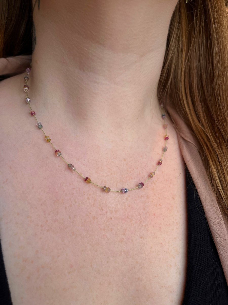 Rainbow colored sapphire bead trios knotted on a nylon cord.