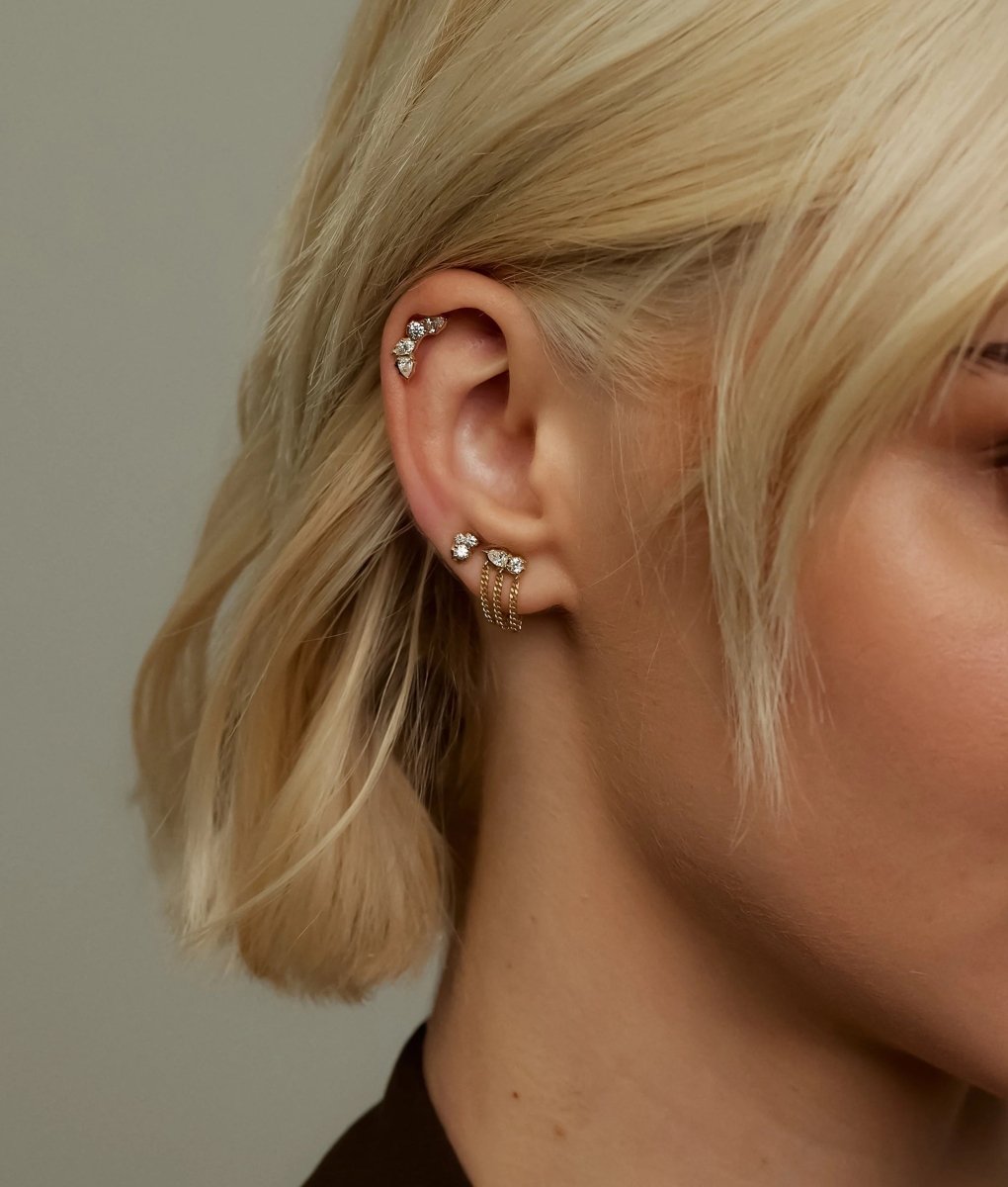 Designed with Jade Trau's signature Posey cluster and three rows of slinky curb chains, the Posey Chain Loop Earrings are casual yet still feel like they can be dressed up. Handcrafted in 18-karat and featuring 0.13tcw of round and pear shaped diamonds, these are the perfect lightweight earring that still feel like a statement.