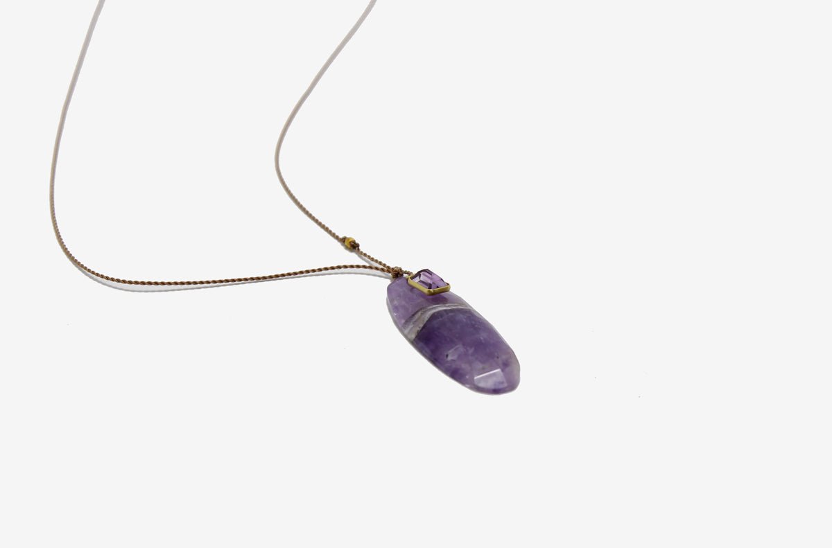 An elongated oval shaped piece of amethyst with a small amethyst bezel set in 18k gold knotted on a light brown nylon cord.