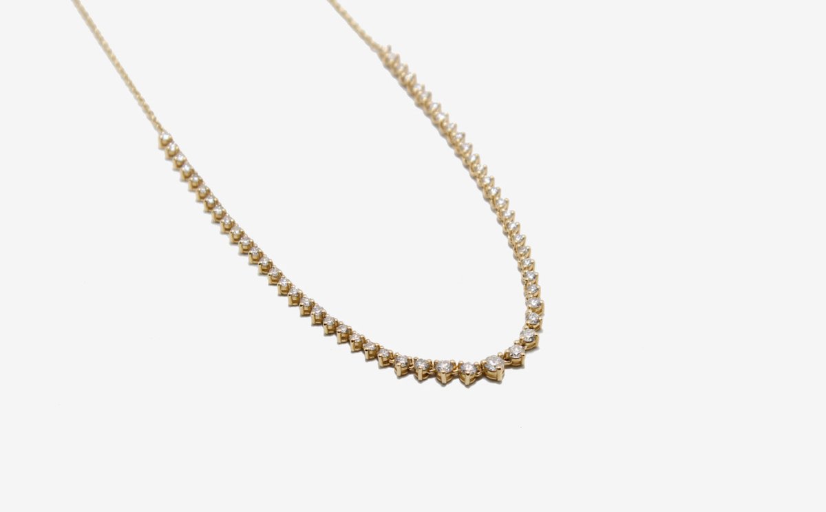 A round diamond half riviera necklace on a delicate gold cable chain. Perfect for every day or a night out.