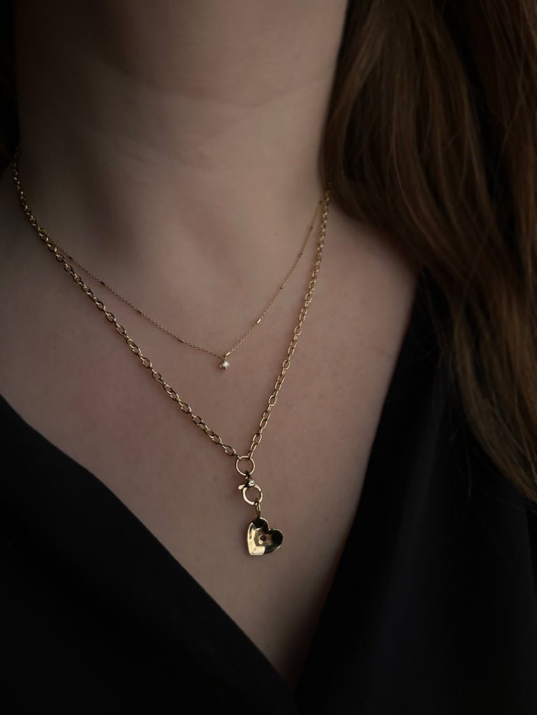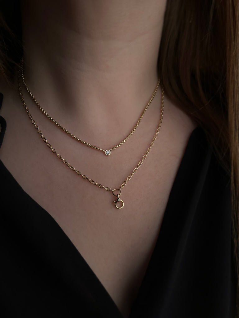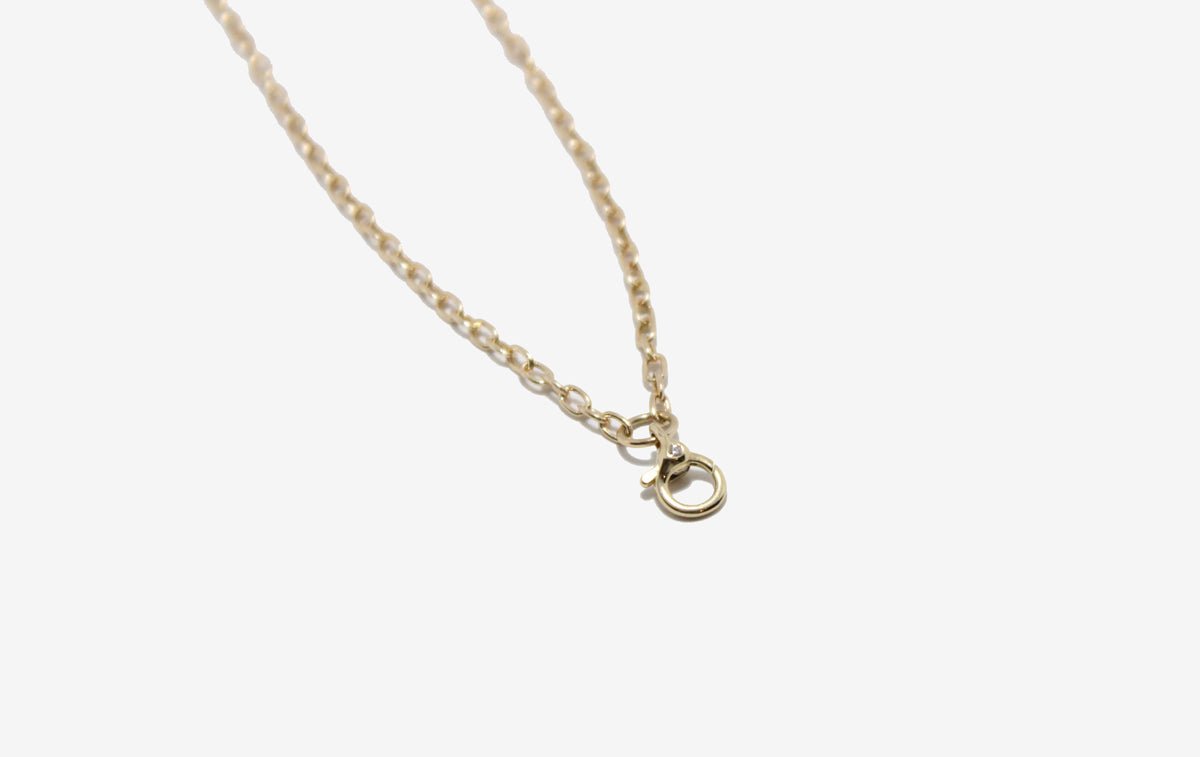 A small square oval chain necklace with a lobster clasp drop set with a diamond on each side. Add you favorite charm(s)!