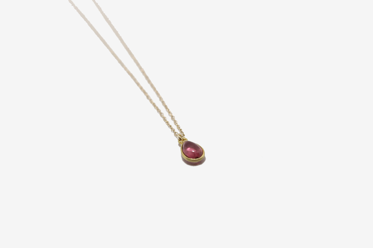 A bezel set pink tourmaline charm on a delicate gold chain.