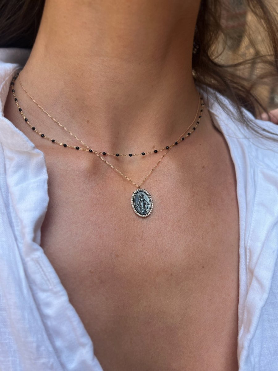 Oxidized silver Miraculous Medal with a halo of white diamonds set in rose gold on a delicate cable chain necklace.