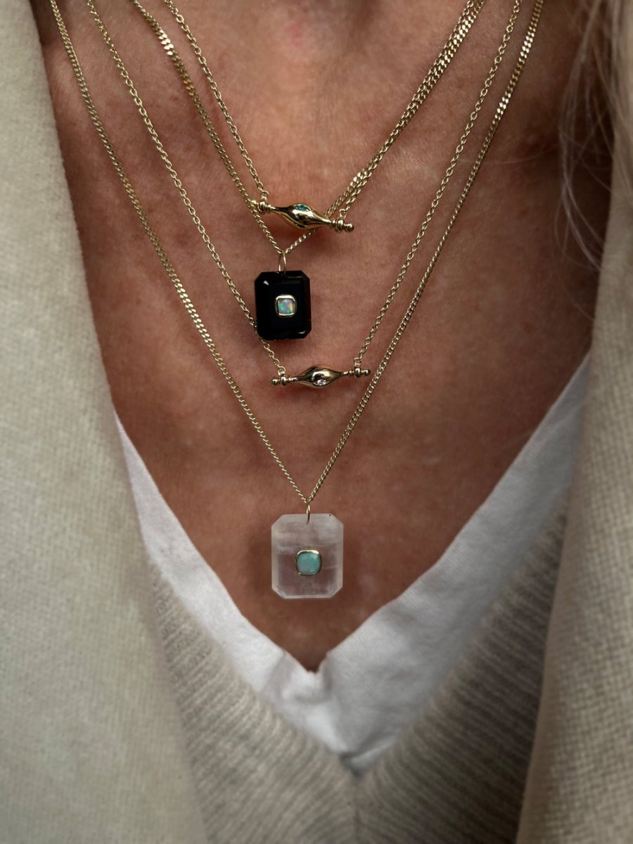 An emerald-cut caviar-black onyx, embedded with an iridescent opal on a curb chain.